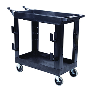 Heavy-duty polypropylene and steel-reinforced construction ensures TOUGH & DURABLE performance, impact, scratch, and stain resistance. High load capacities of 500 lb and 600 lb across two shelves accommodate various materials. Efficient transport with 5" casters, ergonomic molded handles, and easy assembly in under 10 minutes. MADE IN THE U.S.A.