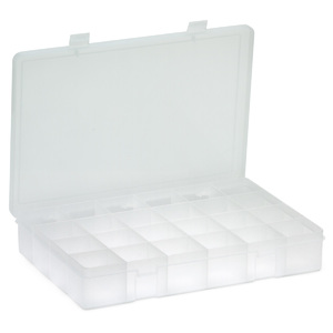The durable storage boxes feature clear polypropylene construction, which provides organization for small parts and allows for easy identification of the items inside. They are equipped with a latch closure that helps keep the boxes securely closed, reducing the chance of spilling parts or mixing between compartments.
