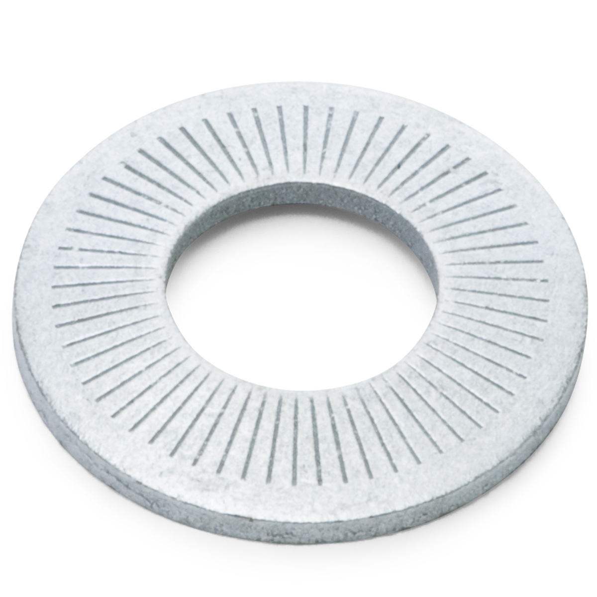 The lock washer features a conical shape that provides extra holding strength in high-vibration applications. Its ribbed design includes ribs on the top of the washer that securely lock it to the fastener, preventing loosening from vibration. Additionally, the non-ribbed underside offers locking strength without marring the mating surface.