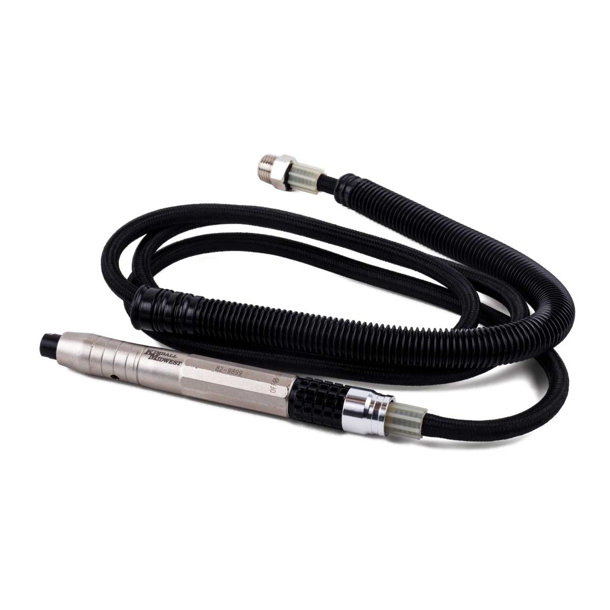 Ergonomic design with an attached 4'10" airline and 1/8" collet for dexterity in shaping and grinding intricate parts. Versatile for deburring, smoothing, and blending. Variable speed control up to 72,000 RPM for precise operation. Weighs less than half a pound for reduced user fatigue. Ideal for tight spaces.