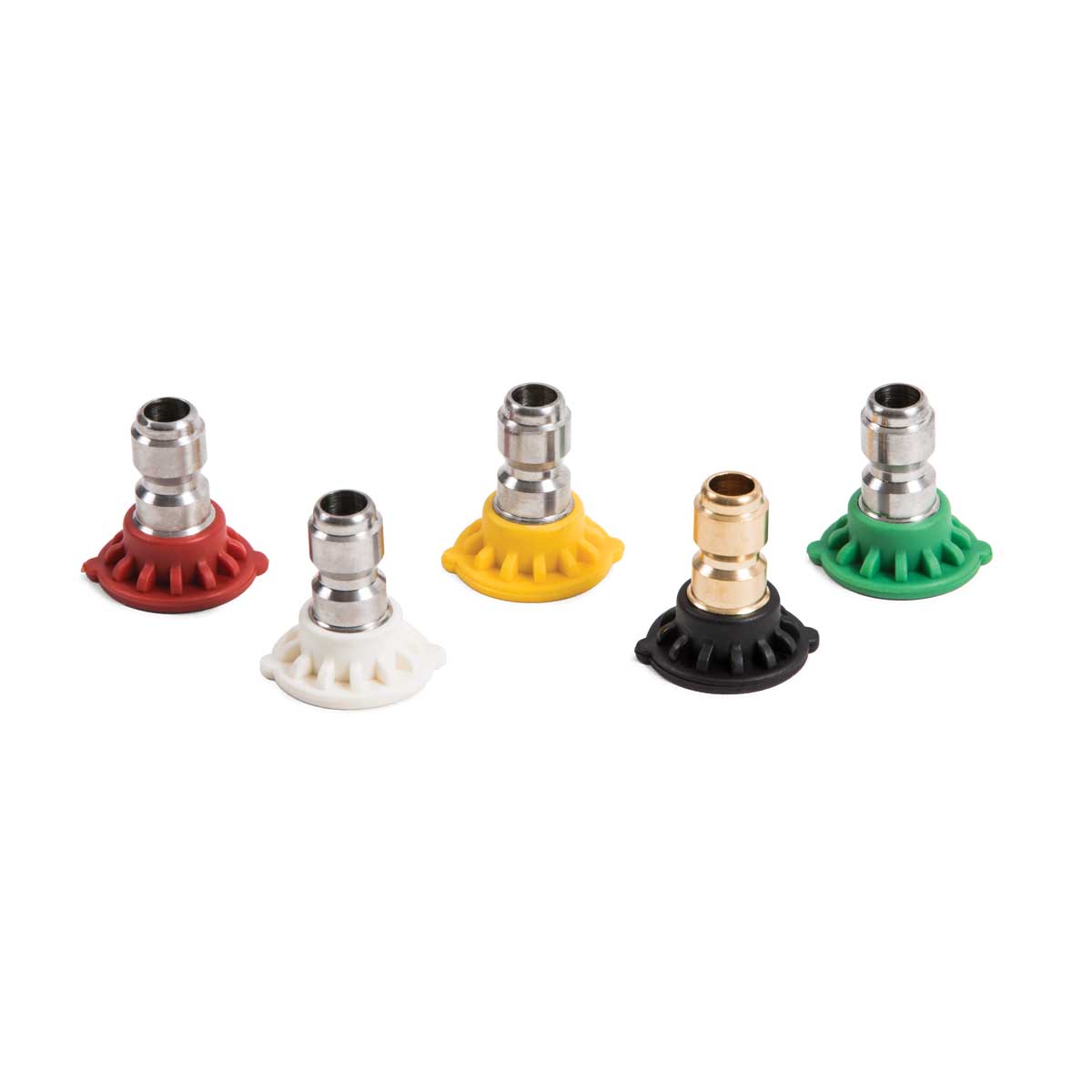Designed for compatibility with most standard 1/4” power washer and pressure washer wand couplers. Features various spray patterns from 0° to 40° and a 65° detergent nozzle. High pressure rated up to 4,000 P.S.I. and temperature rated up to 300°F, with the brass detergent nozzle rated at 600 P.S.I.