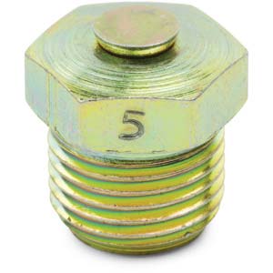 Fittings designed to open at predetermined pressures to vent gear boxes, bearings, and other closed systems. Protects seals from catastrophic blow out failure. Features one directional flow with internal check valves that vent internal pressure while preventing external air entry. Stamped with the upper pressure limit for quick identification.