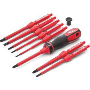 Complete portable screwdriver set featuring 1000 volt AC insulated blades for electrical and general applications. Includes 8 magnetic driver tips for fastener retention, a precision adapter for confined areas, and a durable carrying case. VDE Certified according to IEC 60900:2004 standards.
